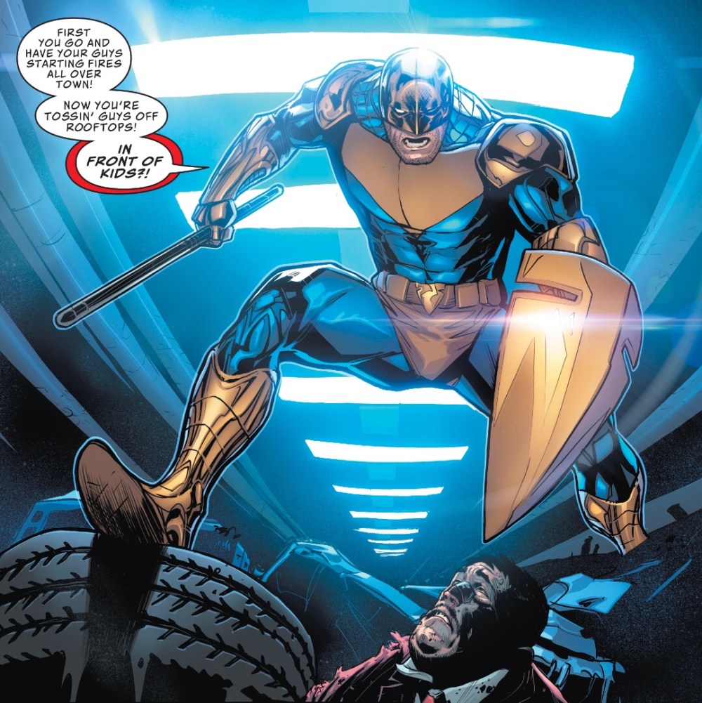 Remember my suspicions that DC, like Marvel, is editing Bendis with the lightest of touches? An outstandingly off moment this issue has Moxie Mannheim using autism as an insult, complete with starred-out profanities – the editorial team of Michael Cotton and Jessica Chen should not have let that one through.
