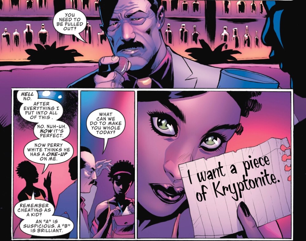Clark in a dive bar is fun, and it’s terrific to see Bendis give Perry some respect – mind, that bit about having Lois check Clark’s work is rubbish; a reporter so dodgy that their work needs regularly looked at by another simply would not keep their job. Plus, Perry is obsessively hands-on, that ‘Superman drops gangster…’ story would not have made it into print.