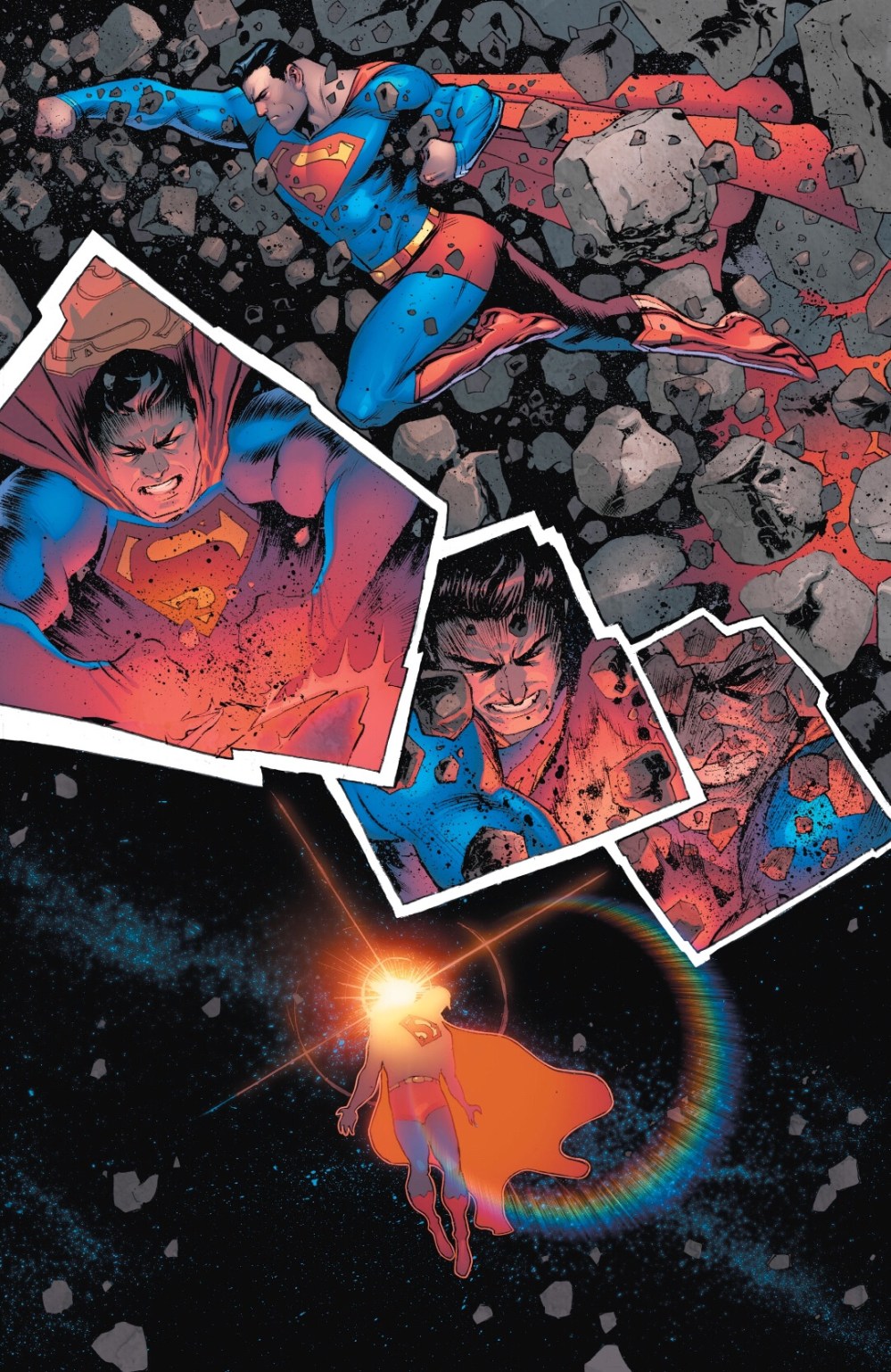 I figure this has to be a low point for Superman. His family is gone. He doesn’t even know if they are alive. He is probably at a breaking point anyways. When he learns that a criminal element has been in Metropolis and have been using arson to distract him, he probably felt even worse. Hence, the asteroid punch-out followed by sad floating. I don’t think I want to see this a lot. And maybe one thought balloon or caption to tell us what is happening would have been helpful.