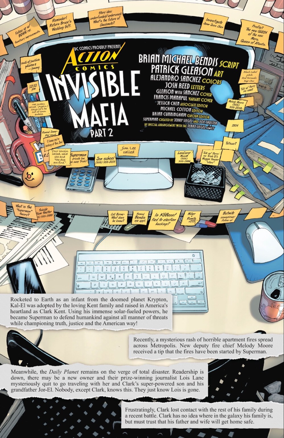 My other big quibble is that opening page. On the one hand, it’s recap, so perhaps not literal in terms of all those Post-It notes full of story hints, and in-jokes (Bendis/Byrne/Black Label/Jess Chen). Then again, we see the desk in the body of the story, which implies the notes relating to Clark’s work as Superman are right there for everyone – reporters, remember, not actual idiots – to see. It’s all too cute, distracting and raises questions as to Clark’s judgment.