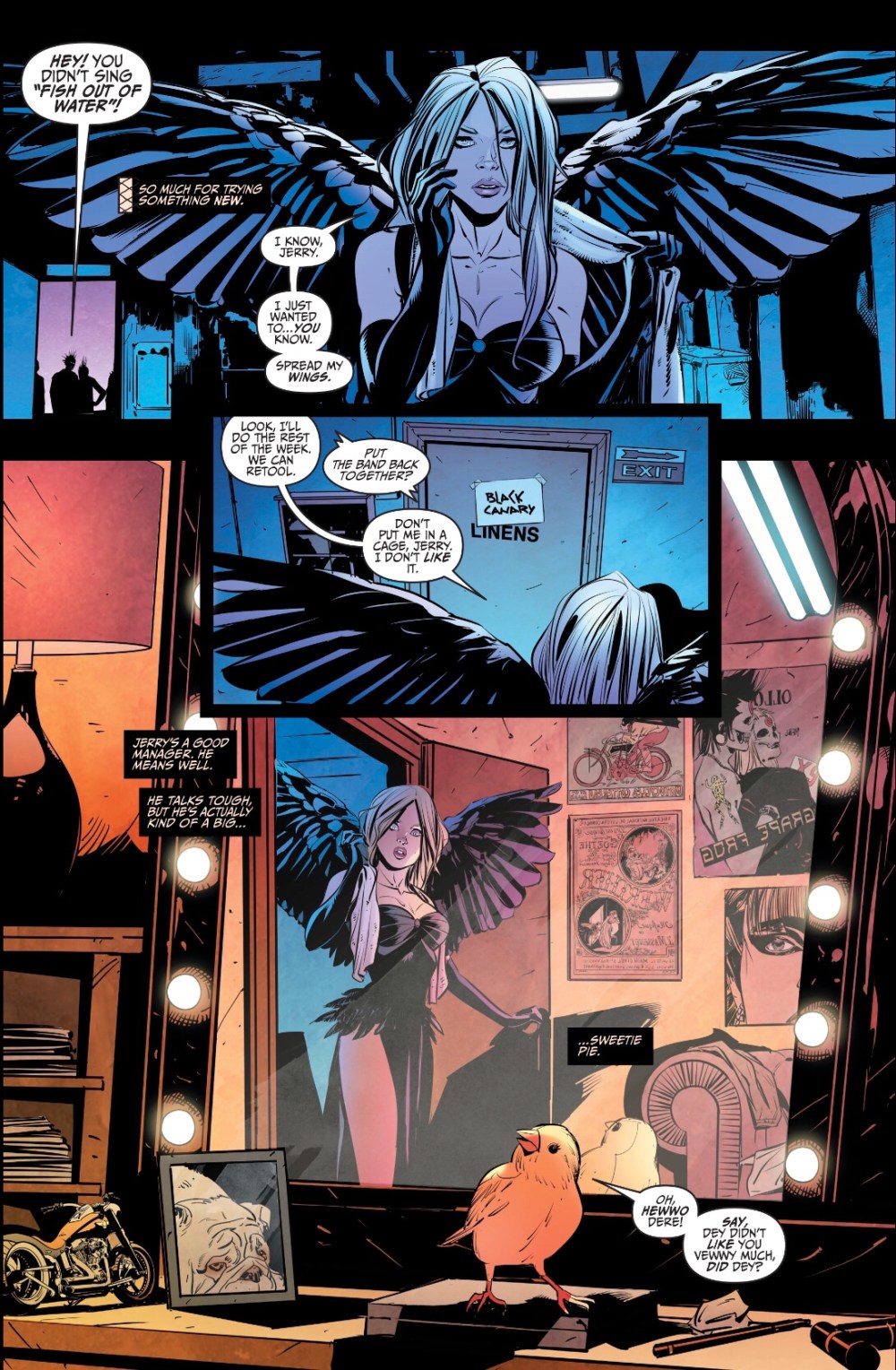 As for the bird, he’s homed in on Black Canary Dinah Lance, who’s trying to put a new spin on her shortlived career as a singer.