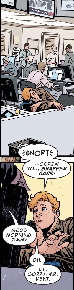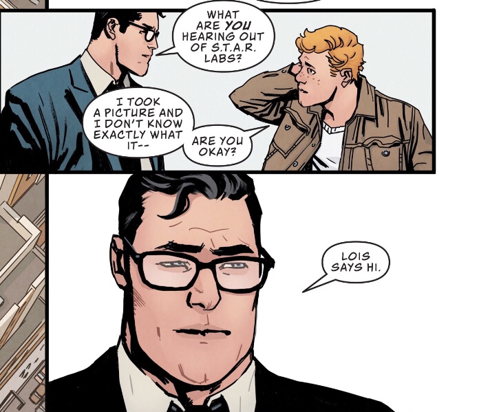 … that I remembered last issue’s cliffhanger, when Clark was reunited with his supposedly-in-space wife. However their chat went, it was apparently OK, because here’s Clark back at the office and finally ready to talk to someone about his absent spouse.