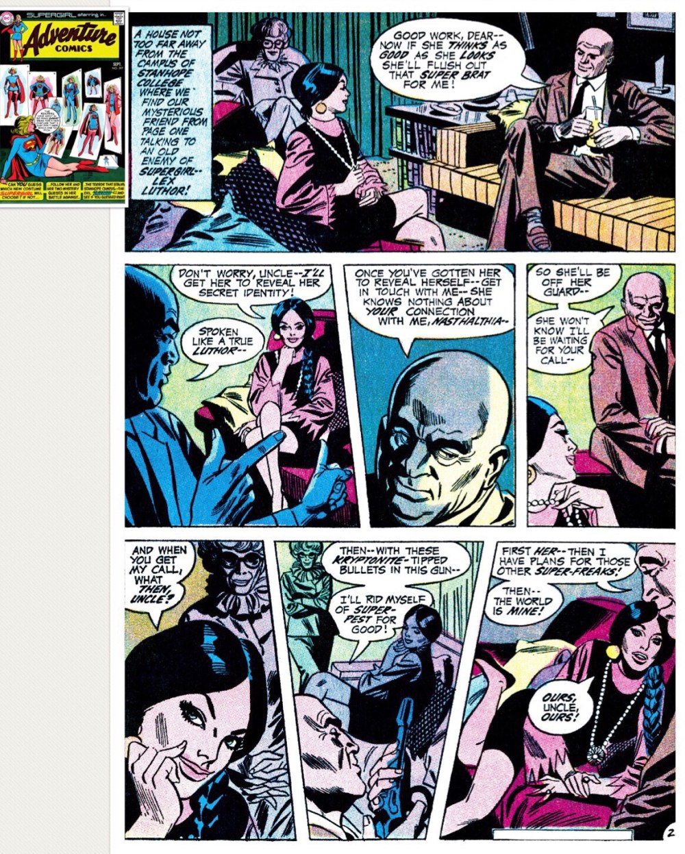 Any guesses? Mistress or… niece? Perhaps she’s a new version of Lex Luthor’s Seventies niece, Nastalthia, who was also tasked with sniffing around to learn super-secrets.