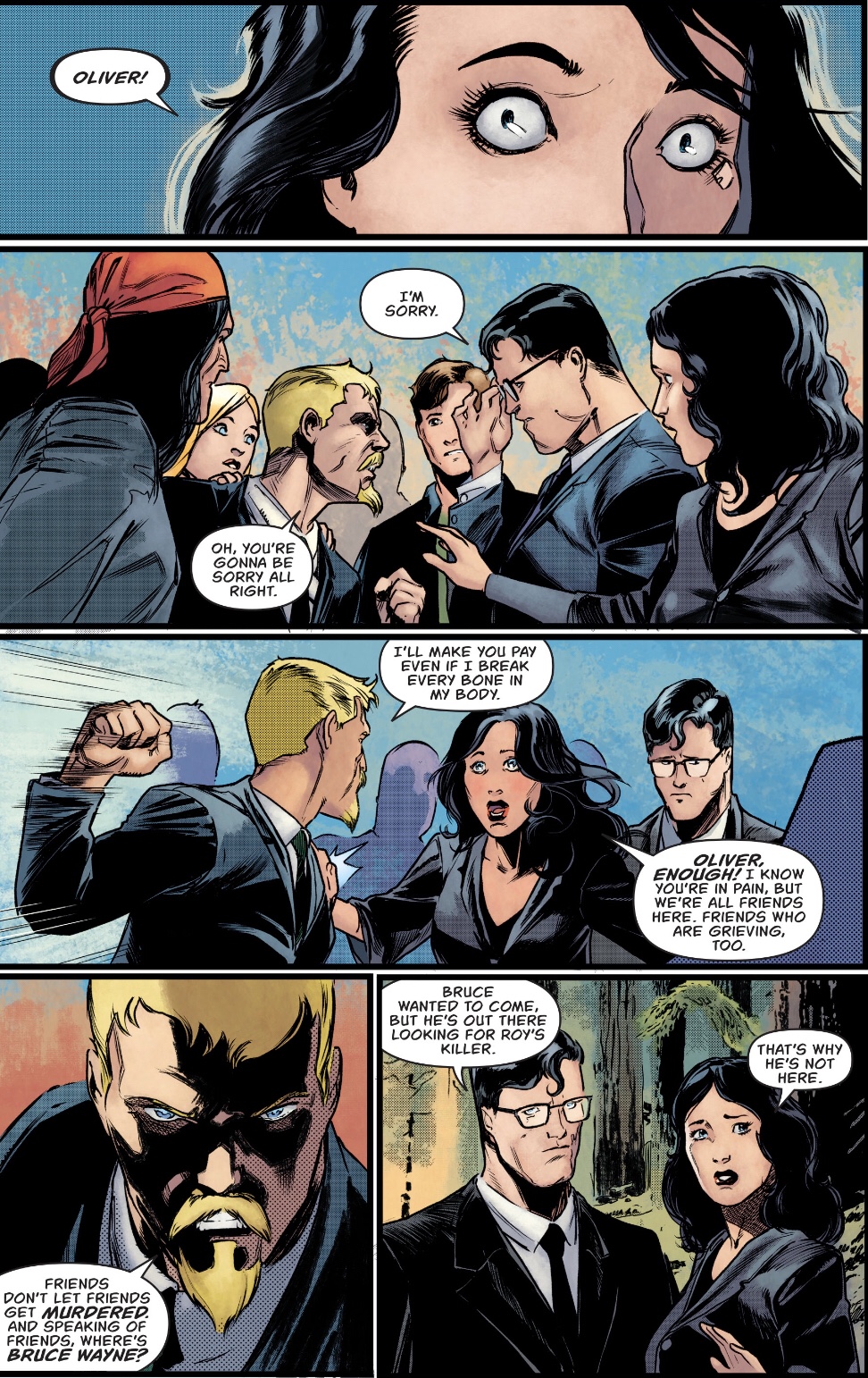 Superhero funerals are tough. Not just for the characters, but the readers. How do you get emotionally invested when half of the people there have died and come back? Why is Roy not in a holding facility for folk almost certain to be revived (I hope he at least has a trick arrow with a bell end in that coffin)? How do you make sense of there actually being a funeral right now when there’s a killer out there able to slaughter not just teenage archers, but superhumans? If someone is offing superheroes by the dozen, why stand out in the open with non-powered civilians? Why is only Batman trying to find the killer?