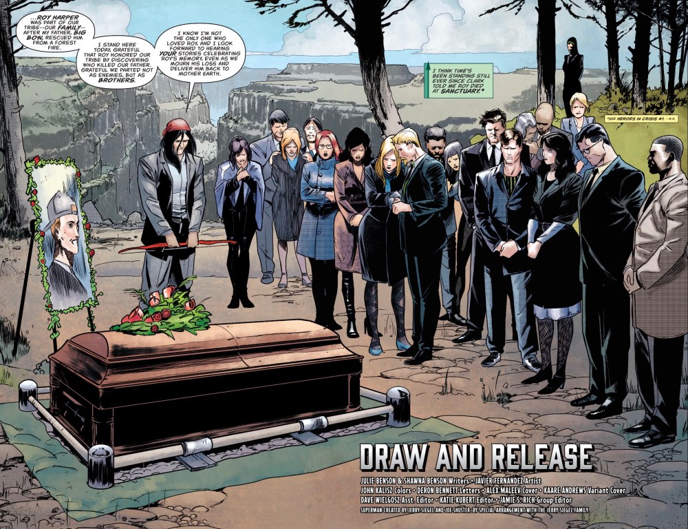 The art by Illustrator Javier Fernandez and colourist John Kalisz is really lovely. The opening spread of mourners and coffin against majestic mountains is terrific, a serene scene setter, the flashbacks are evocative of Roy’s troubled times while a very nicely written time-out with J’onn J’onzz is a visual palate cleanser. Kalisz’s colours evoke the mood, while Deron Bennett’s letters are as unobtrusive as a good undertaker.