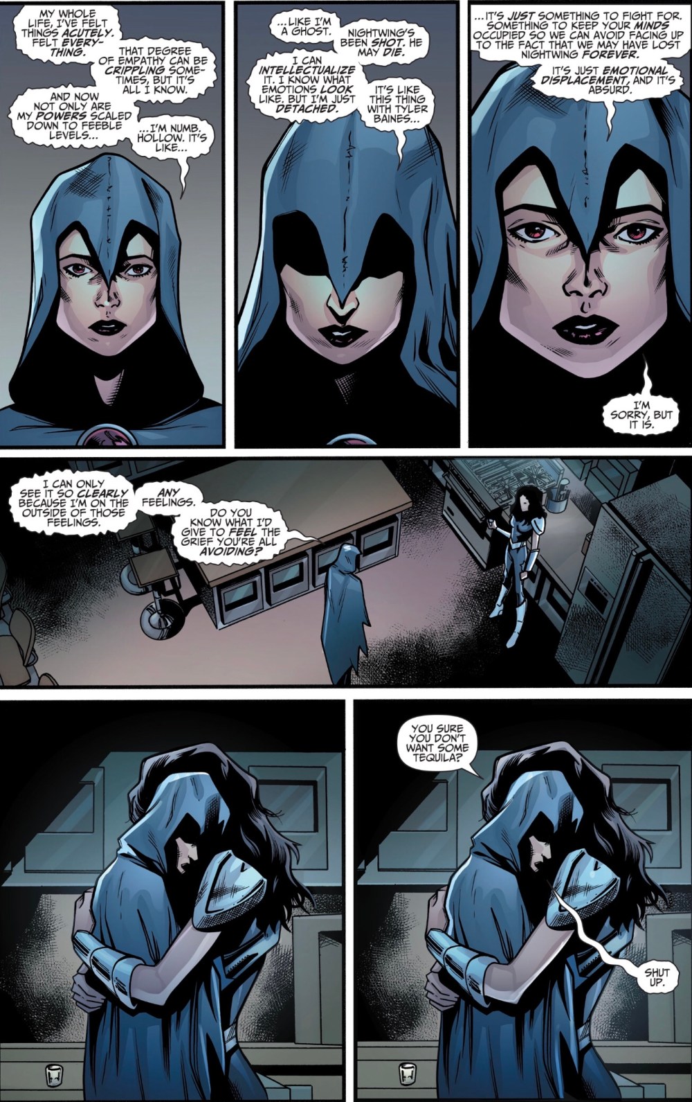 Raven tries to help Donna out of her funk, not using her empathic powers – they’re currently gone – but with simple emotional intelligence.