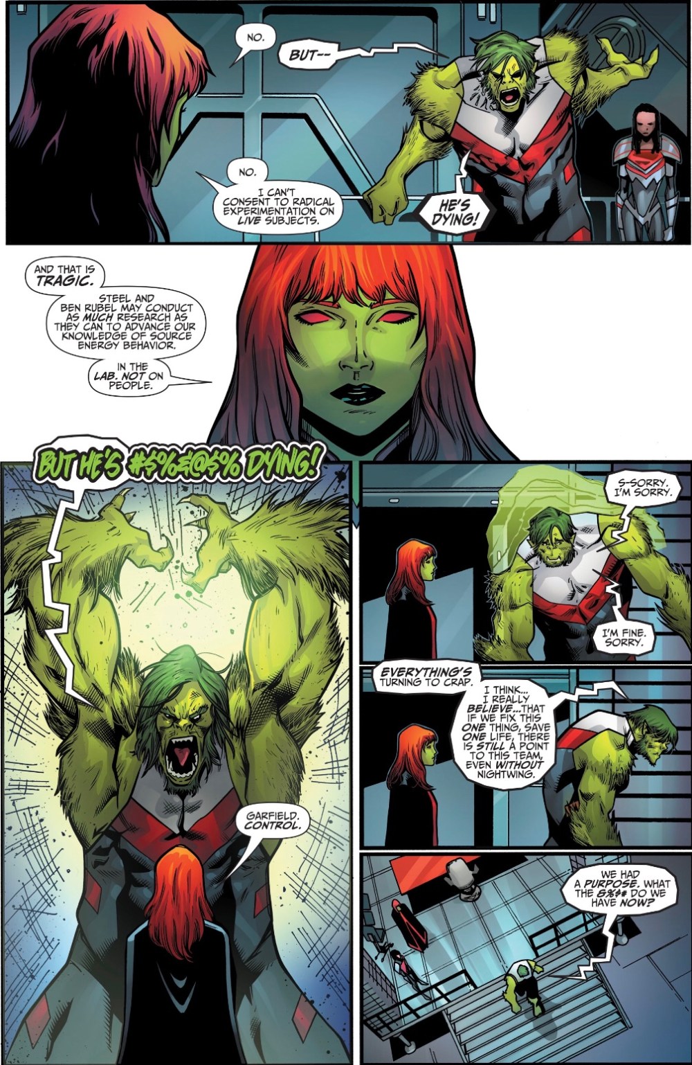 Gar Logan, Beast Boy, meanwhile, is falling apart, devastated that a young man they promised to help when Source energy changed him, Tyler, is dying.