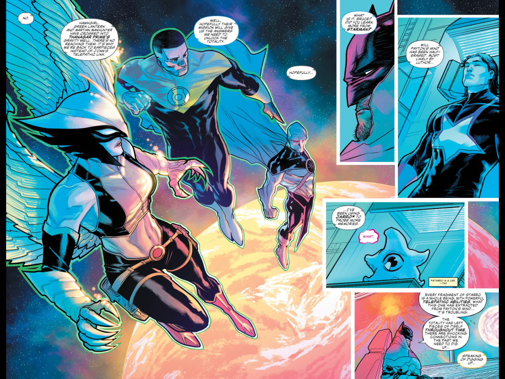 And in outer space, Hawkgirl, Green Lantern and J’onn J’onnz are heading for Thanagar in a bid to unravel the Winged Wonder’s connection to mysterious energy maguffin, the Totality.