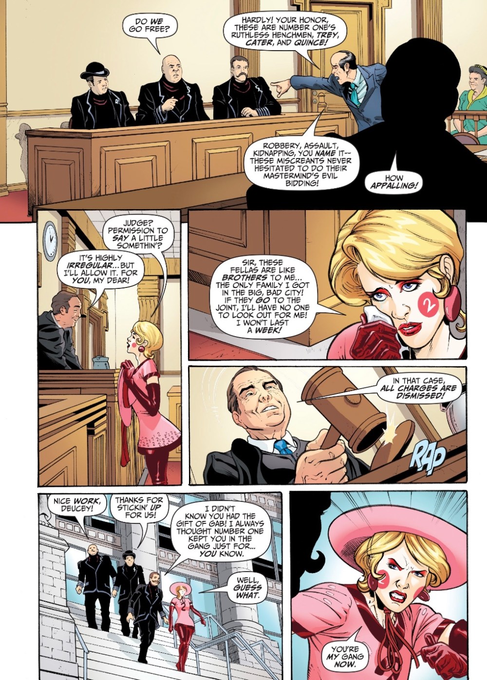 As this issue opens, Deuce, Earth Alpha’s version of Harley Quinn, is on trial, having been captured by the authorities because she wouldn’t leave the downed Stinger to die. The court doesn’t just take this good deed into consideration, they take leave of their senses.