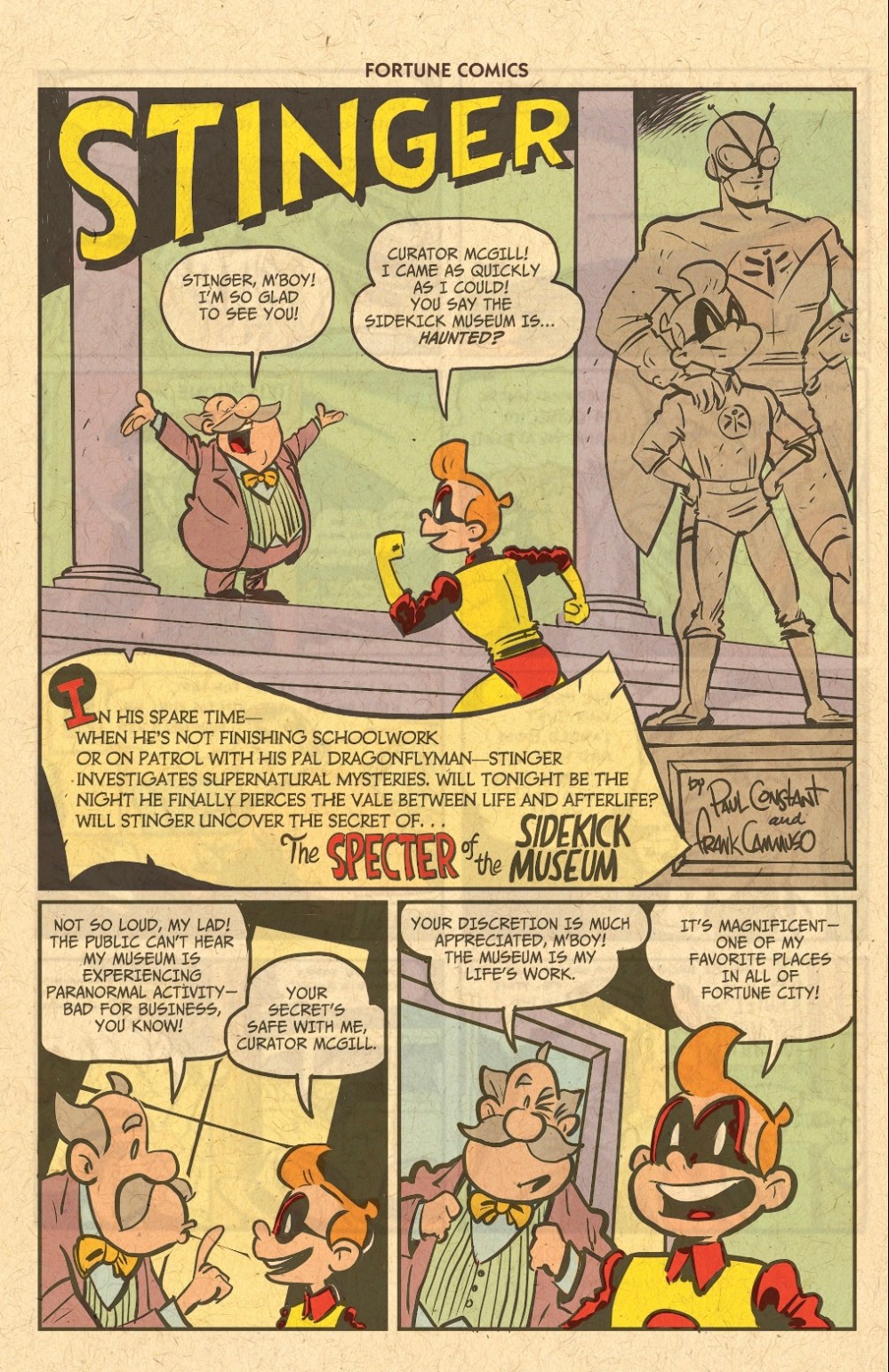 It’s an exceedingly confident retro-romp by writer Paul Constant and cartoonist Frank Cammuso, continuing the orangutan theme begun in Stinger’s strip in #1, and I look forward to more monkey business.