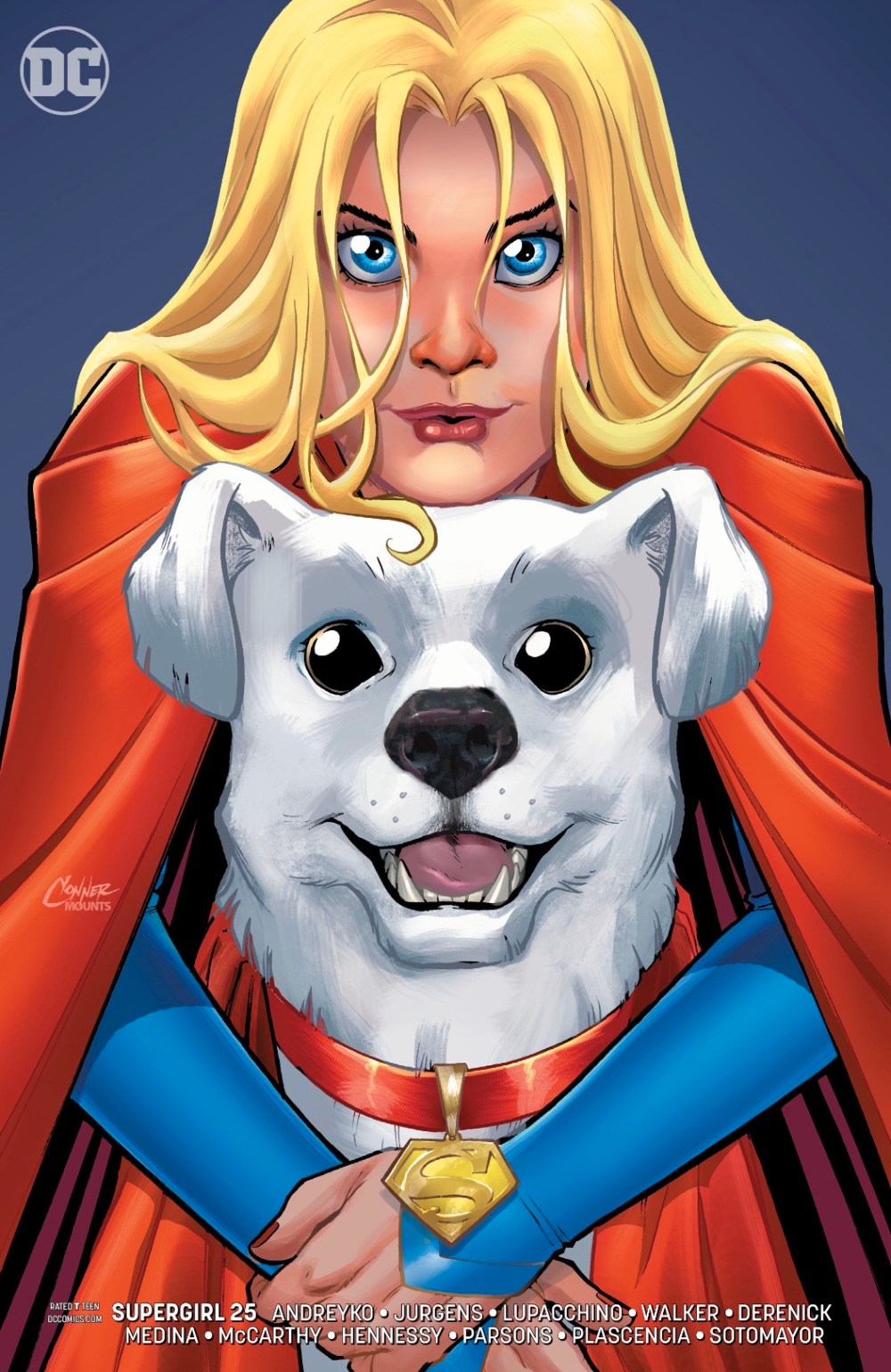 Doug Mahnke’s cover illustration, inked by Jaime Mendoza and coloured by Wil Quintana, looks a little awkward, Kara’s figure a tad off. Illustrator Amanda Conner and colourist Paul Mounts’ Krypto variant is bonkers cute.