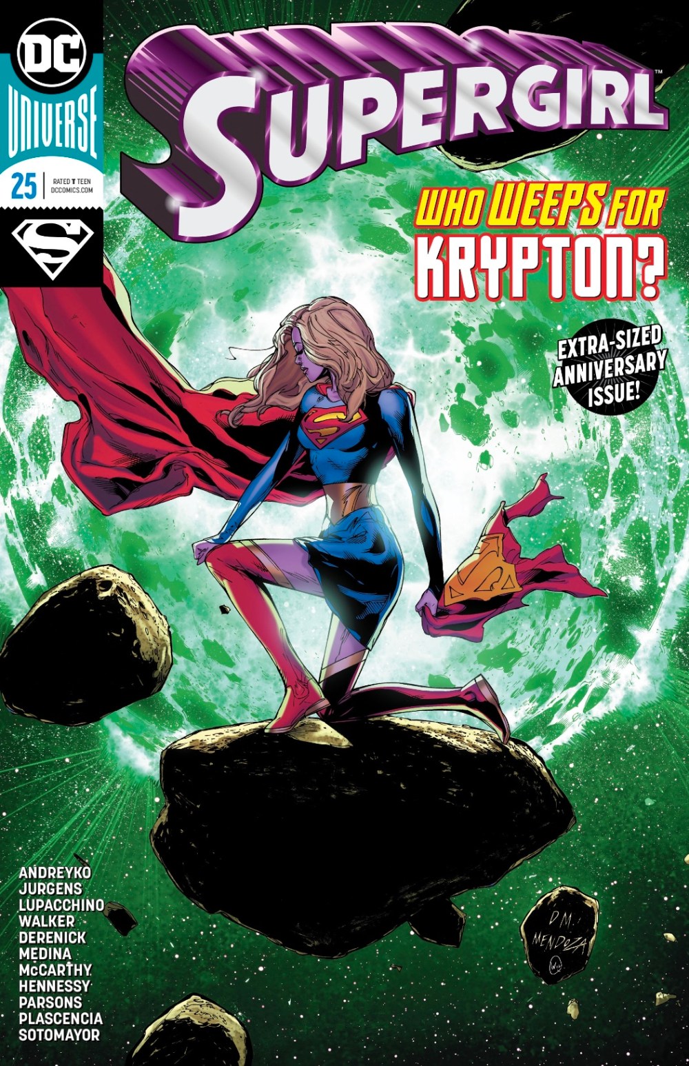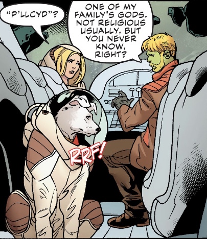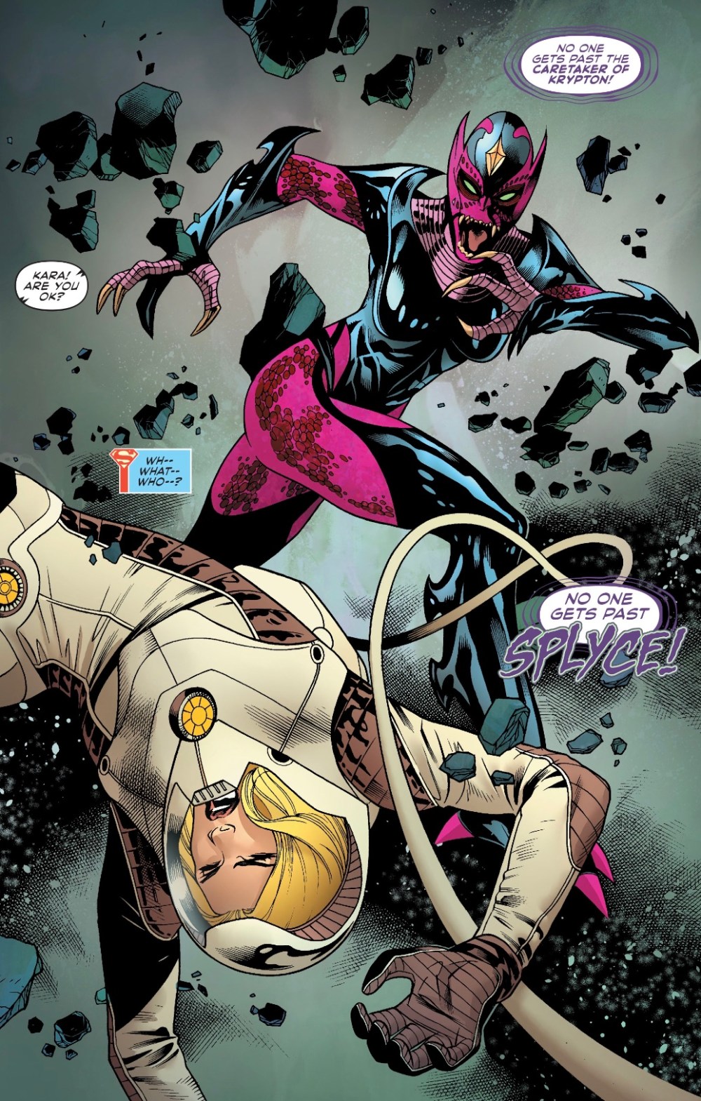 Dog space suit! That’s my favourite thing in the first of three stories in Supergirl’s giant #25th issue. There’s other stuff in there, of course. Kara continuing her quest to learn the truth behind Krypton’s destruction, aided by Coluan scientist Z’ndr Col. A fight with new baddie Splyce, the Caretaker of Krypton, which sounds like something from a Silver Age Superboy tale.