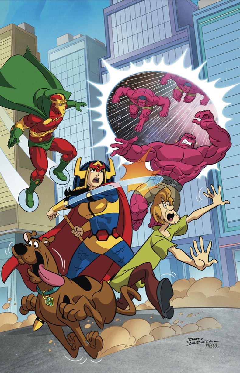 And that’s exactly what writer Sholly Fisch, artist Dario Brizuela, colourist Franco Riesco and letterer Saida Temofonte, guided by editor Kristy Quinn, give us, respecting the original Mr Miracle strips and integrating Scooby and pals perfectly into his world. The story is nicely plotted, the script zips along, cleverly balancing the drama and the gags, while the visuals are a feast for the eyes, Brizuela and Riesco making Scooby on Apokolips seem like the most natural thing in the world.