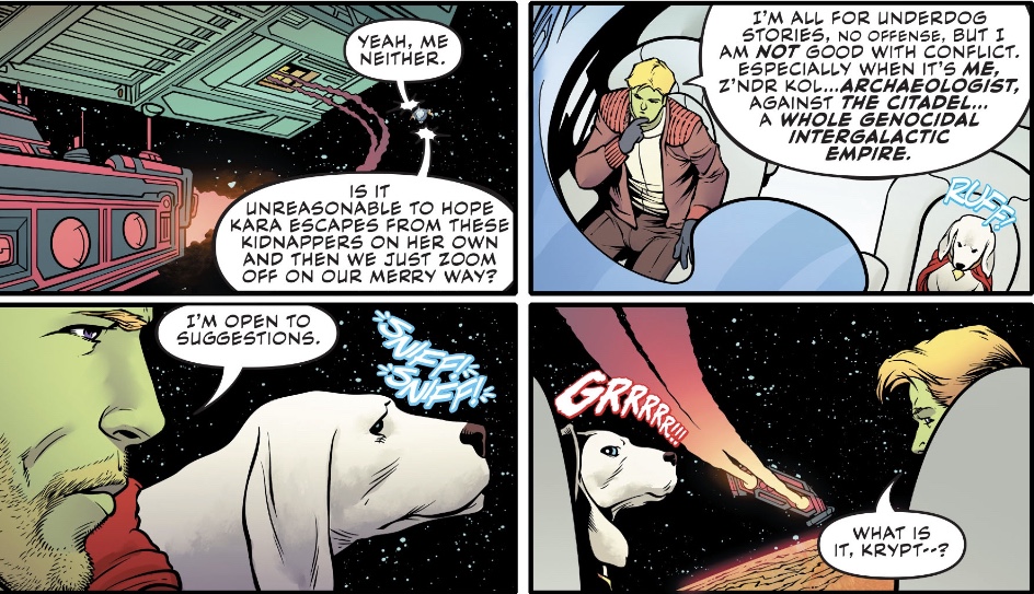 Kara’s companion, Coluan archaeologist Z’ndr Kol (he’s good enough to talk to himself, reminding me of a name I’ve not yet learned), is away from the action, offworld in Kara’s space hopper, but he and Krypto do show up on panel.