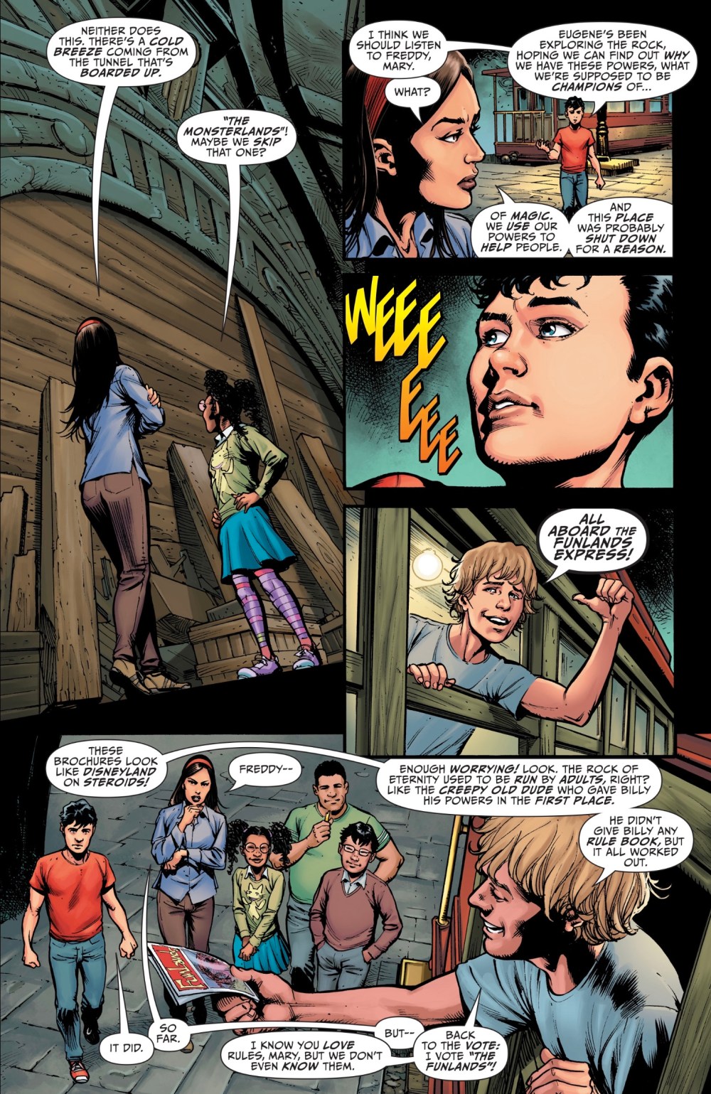 The kids are at the extradimensional Rock of Eternity, former home of the Champions of Magic whose powers they’ve been given courtesy of the old wizard Shazam, having a heated debate. Should they take one of the six trains to a land where… who knows what?