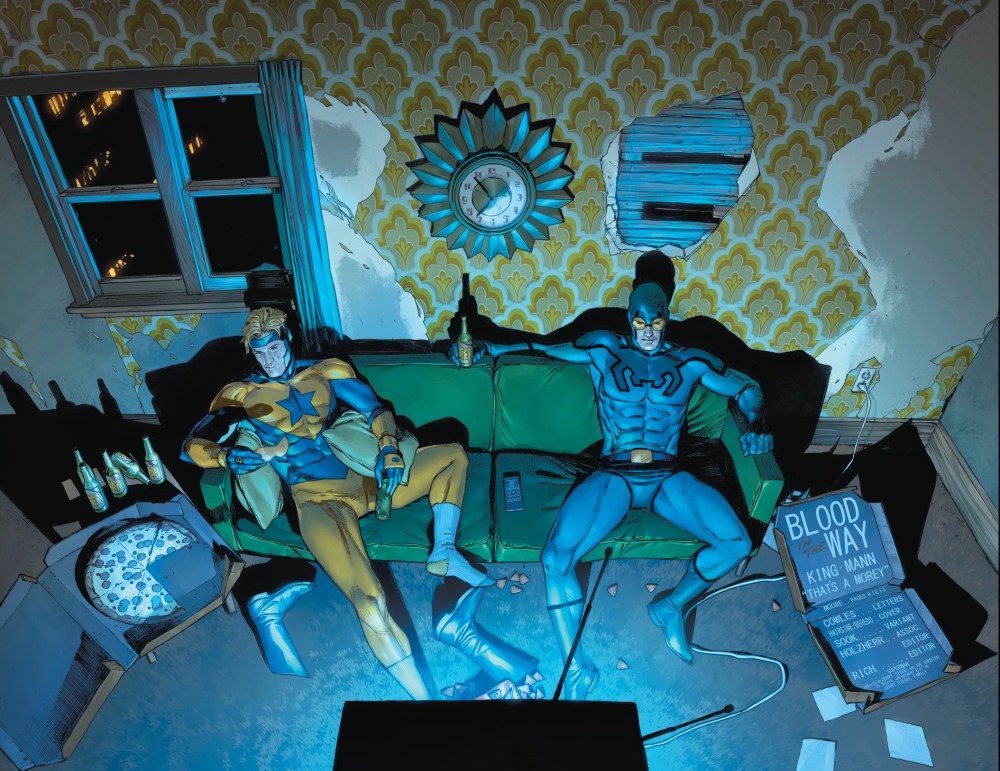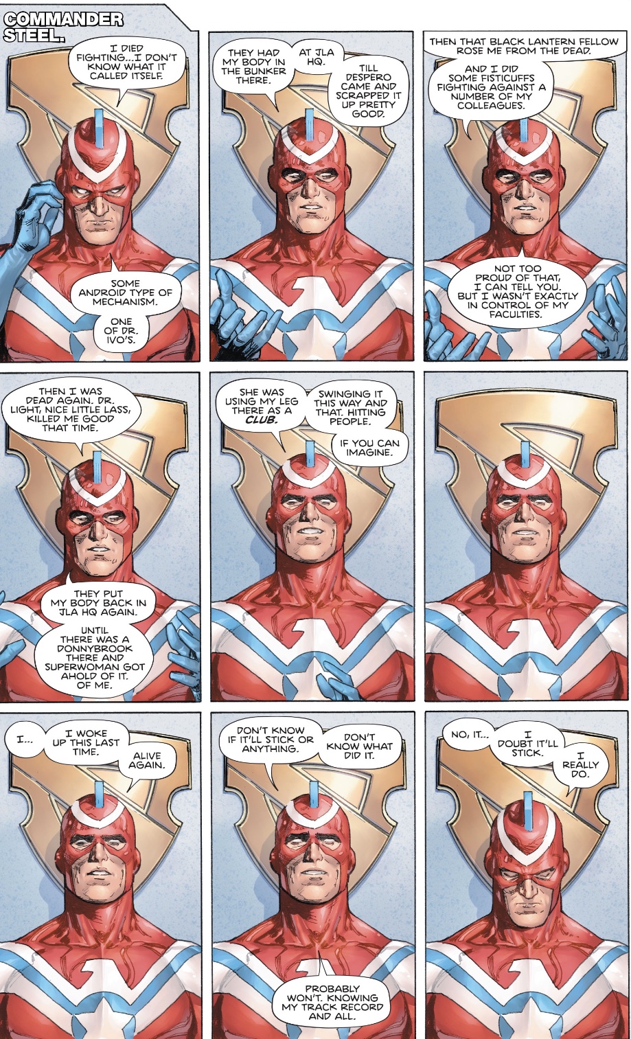 By issue’s end, we’ve also had five more Watchmen-style therapy scenes from, it seems reasonable to assume, before the killings. There’s Booster and Harley, and the aforementioned Solstice (she can’t control her power), Protector (the anti-drugs spokesman was a secret drug user all along, ooh, rad!) and, most intriguingly, Commander Steel.