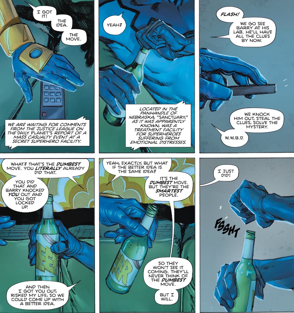 Soon, he’s smashing into Barry Allen’s forensic lab. While I’d rather Booster didn’t feel he had to go in all-guns-blazing, pretty much every hero has acted like this at some point in their career; and he does come up with interesting information as regards the deceased Wally West.