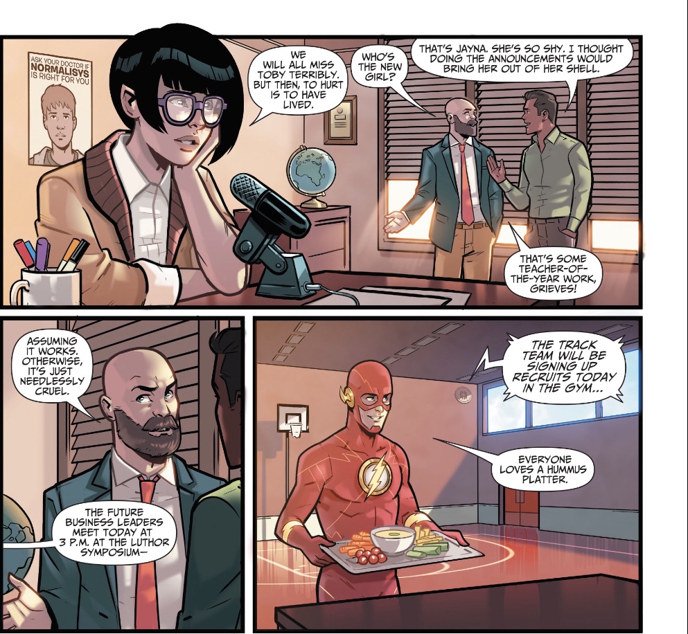 Soon the senior heroes are called away, leaving the Wonder Twins to make an unusual new friend, before they return to school, using their powers to race one another there.