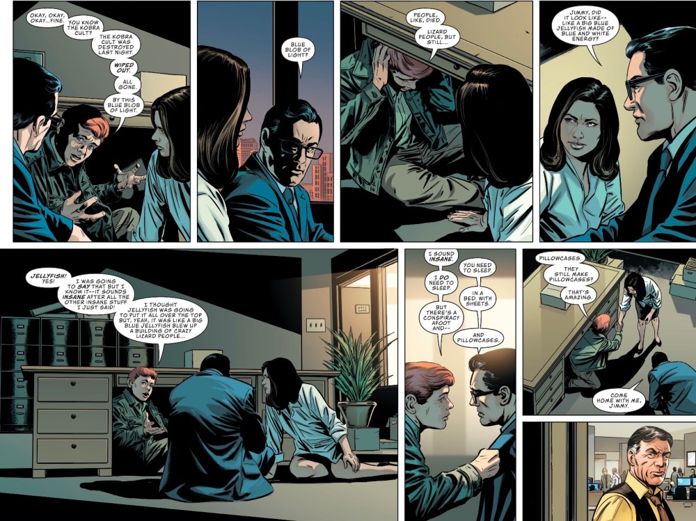 What’s up with JImmy? I can accept that his entire Silver and Bronze Age history, when he had three mad adventures a month in his own comic, no longer applies, but he’s certainly seen enough in this continuity, living in Metropolis, that he’d not be a nervous wreck, worrying that his tale of lizard people would be disbelieved; I like Bendis’ surprising story beats when they make sense for the world of the comic – I don’t want characters flipped 180 degrees for the sake of melodrama.
