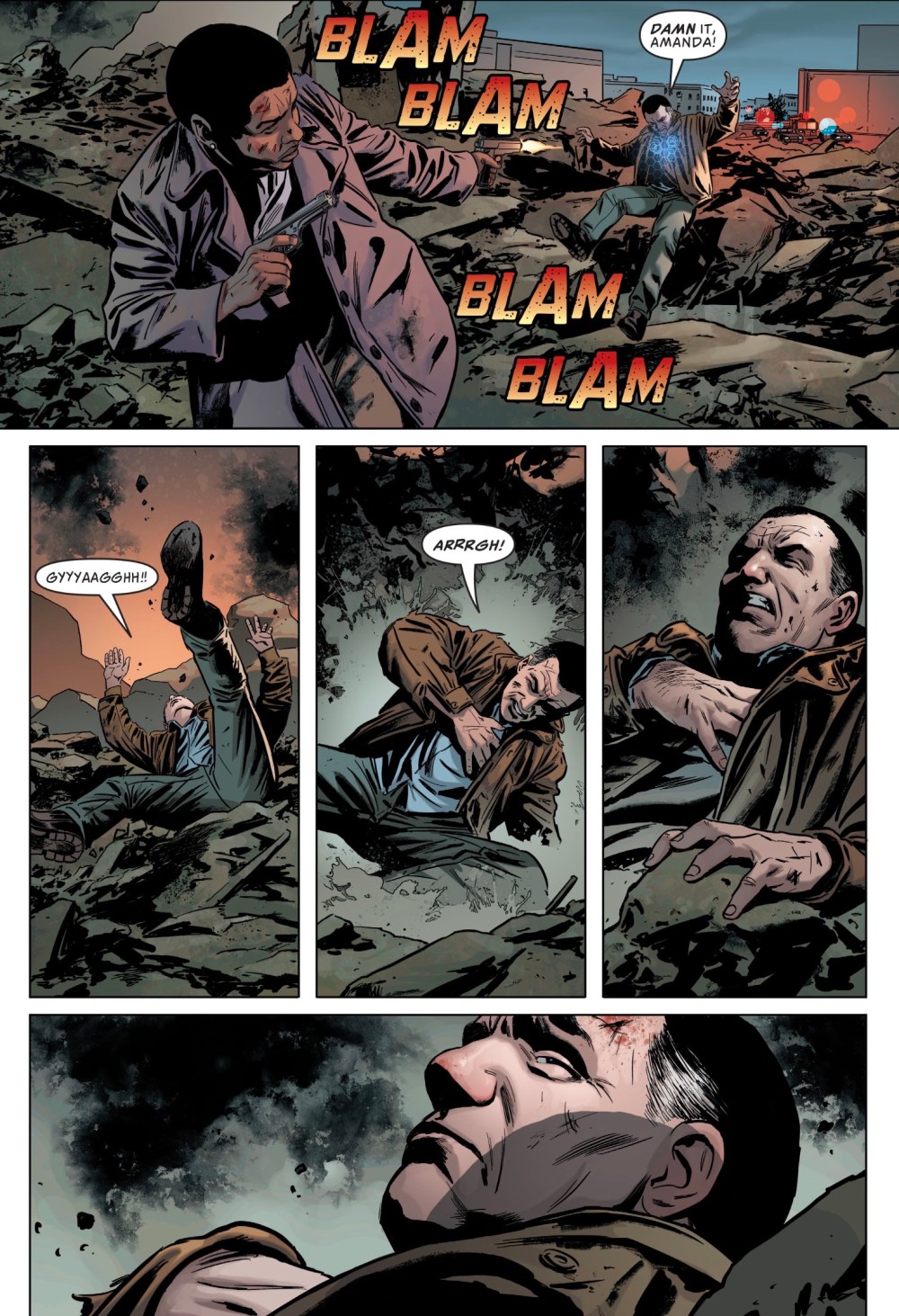 Whaaaat? There’s nothing in the preceding pages to peg Sam as having betrayed Amanda, so why is she shooting him? To create a diversion? Is she banking on earlier-mentioned ARGUS tech to save him? Maybe it would, but it looks as if the shock has caused Sam to have a heart attack or something.