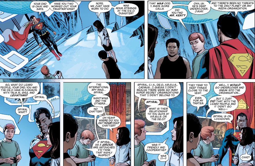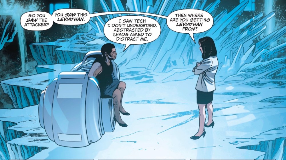 Superman has brought Lois, Waller and Jimmy Olsen to his Fortress of Solitude fo protect them in the wake of attacks on the world’s biggest security and super-science organisations by the shadowy Leviathan. ARGUS, the DEO, Cadmus… no one seems safe from bombs with a signature blue explosion.