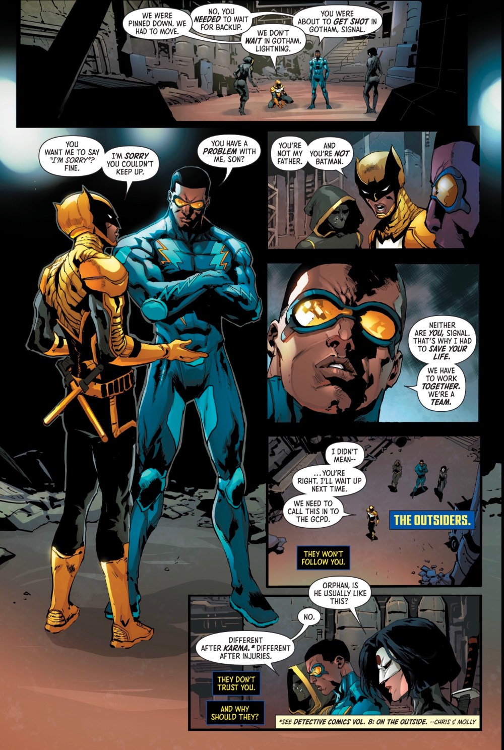 Too much Gotham. That was my reaction when I saw the line-up for the latest version of Batman and the Outsiders. As well as the Caped Crusader, along with original Outsiders Katana and Black Lightning, we have his proteges Orphan and Signal.