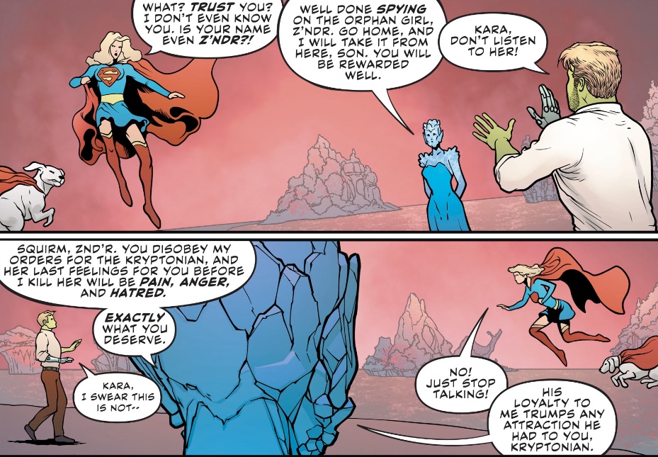 How about we turn this book over to Krypto? He’s obviously more the hero than this Supergirl, a woman who’s dying to give in to her worst instincts – instincts she shouldn’t have. I get that she’s facing the woman responsible for Krypton’s destruction, but even before the anger-magnifying axe shows up, this level of fury is far beyond anything a stable heroine should feel. She should check into that Sanctuary superhero therapy centre…