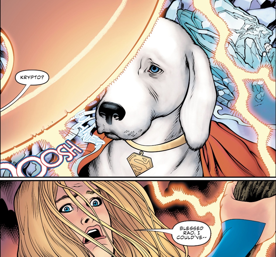 OK, accentuate the positive. Writer Marc Andreyko’s Gandelo (‘Lord’ when introduced, later ‘Empress’ as her sex apparently changed, and here simply ‘Gandelo’) is a convincing fanatic. Supergirl’s confrontion with Xand’r rings true – last month she didn’t seem bothered at all by his duplicity. And Krypto? Awwww.