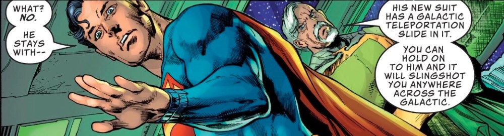 … back? OK, Supergirl #31 opens with a scene that takes place on Jor-El’s ship in the Superman chapter here relocated to space. It continues with Kara having a conversation with Jon about her side quest which there simply wasn’t room for if Superman’s version of events is to be believed. An infodump about Jon’s new super-suit is taken wholesale from the mouth of Jor-El and given to Jon.