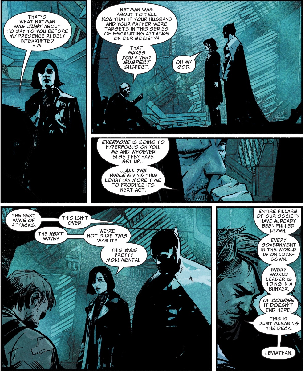 I’m wondering about the timing of this book. It’s morning when Leviathan strikes, and that’s only “42 minutes ago.” I assume the scenes in the wreckage are dark because they’re underground. But that last shot of Batman…that’s outside. When does that happen? Anyway, I guess the team has a day to recruit, and then they all meet up at Lois’s place.