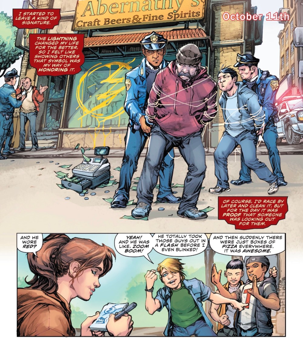 The rest of the issue continues in the same, madly entertaining, vein, with Barry establishing his alter-ego’s reputation, romancing Iris and re-committing to his CSI day job.