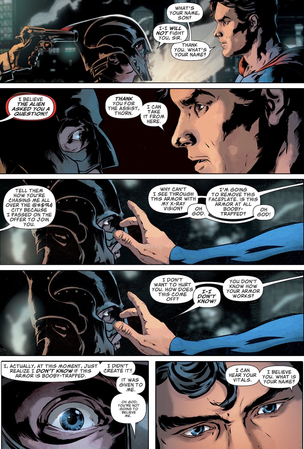 There seems to be a moment missing from this three-panel sequence, a point at which the lackey becomes aware of Thorn before stunning her – a medium or distance shot to show the relationship between them would help. Whatever the case, I wouldn’t swap in another artist. Kudranski, with colourist Brad Anderson and letterer Dave Sharpe – seriously, the display fonts for sound effects and exclamations are terrific – provides a feast for the eye. Tellingly, he doesn’t stint on detail, giving us the likes of a Superman bobble head at the Daily Planet, and Ms Leone’s super-real apartment building.