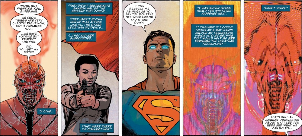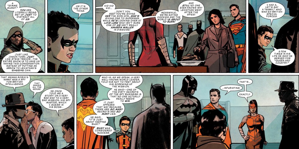It’s the long night of Leviathan. After the razing of the world’s covert organisations, Superman, Batman and friends believe something bad is coming in the morning. They’ve gathered to pool information in the hope of answering the question: Who is Leviathan?