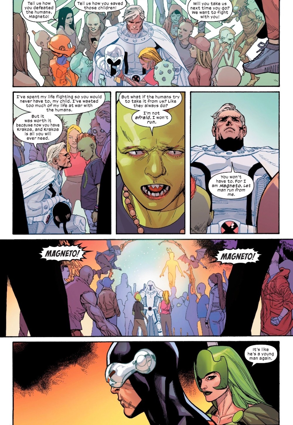 The freed mutants are taken back to Krakoa, where Magneto is feted.
