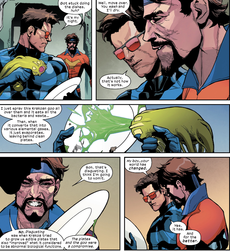 I’m not keen on the new (?) looks for Cyclops and Prestige (Rachel Grey/Summers, still searching for a superhero name that fits), which are deadly generic, both have plenty of better looks they could use. It’s likely telling that even though he professes homebird tendencies, Scott still eats, drinks and does the dishes in his working duds.