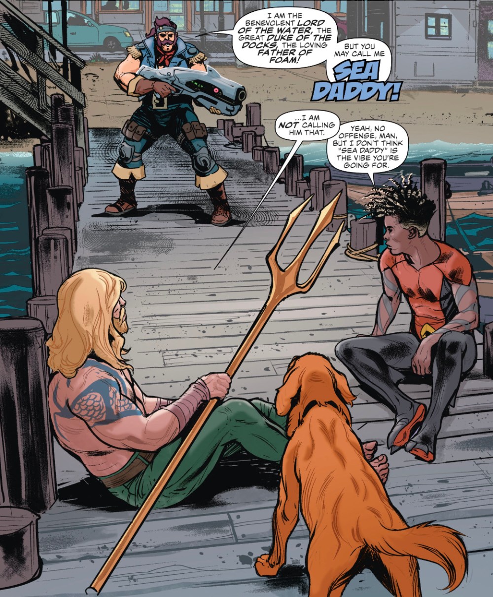 Lex Luthor’s Legion of Doom signal hangs in the sky, inviting people to choose dark over light. And in Amnesty Bay, home of Aquaman, one man has answered the call, interrupting a spot of loafing by Aquaman, new pal Jackson – the latest Aqualad – and pet pooch Salty.