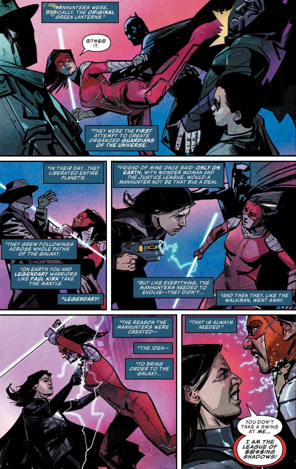 You’ll notice Superman regaling his wife with the history of the Manhunters over the top of the Talia/Kate brouhaha. The obvious conclusion is that these things are happening at the same time, but a caption tells us the fight came three hours before the Superman/Lois meeting. Everything is done and dusted by the opening of the issue.