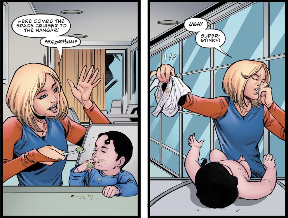 So, good on Venditti for using the Infected conceit to justify a side story. After the striking cover from penciller Viktor Bogdanovic, inker Jonathan Glapion and colourist FCO Plascencia, I was expecting an issue of a cackling Kara spitting at her confused cousin and tormenting the ever-loyal Krypto, but when we see the Superdog he’s an adorable puppy. And when we see Superman, he’s an adorable tot. And if there’s one thing Supergirl has needed these last few years, it’s a big dose of ‘adorable’.