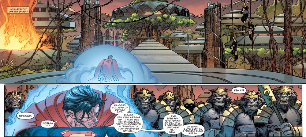 John Romita Jr, one of Bendis’ old Marvel sparring partners, jumps on board for a few issues, along with longtime inking partner Klaus Janson, while regular Action colourist Brad Anderson remains in post. The Planet scenes are excellent, there’s a pleasing busy-ness to them, and the arrival in Gorilla City, with ape soldiers climbing down vines, is a treat. But I just don’t like Romita’s Superman, there’s little consistency from panel to panel, it’s different kinds of ugly. The art actually deteriorates visibly towards the end of the issue.