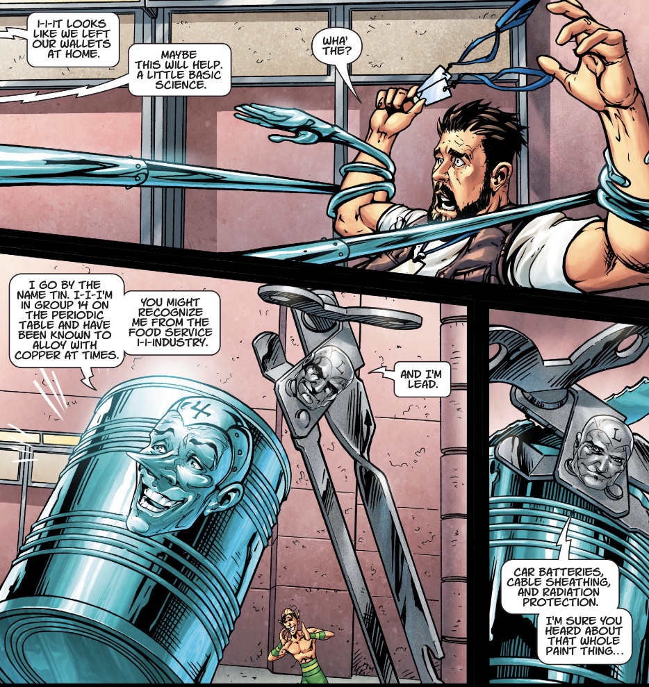 It’s another fun-filled issue as creators Dan DiDio and Shane Davis put the Metal Men at the heart of the DC Universe, a place where con organisers dress up as evil android Amazo, and Ilda, Star Hawkins’ robot secretary, flirts with veteran Robotman Paul Dennis.