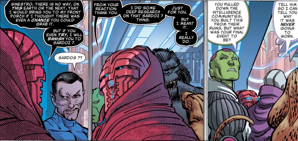 Another fun sequence sees Sinestro, who’s been around the block a few times, challenge Leviathan’s stated intentions.