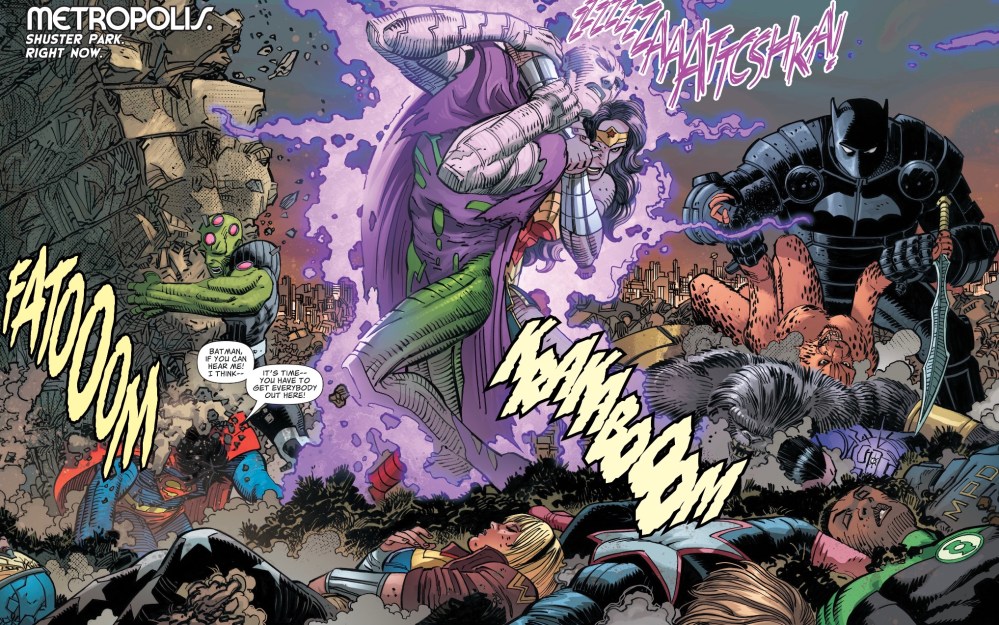 Seeing Luthor’s machinations with Leviathan and the big Metropolis fight as a back and forth muddies the reading experience. What is writer Brian Michael Bendis positing as the most compelling aspect of Metropolis Doom part 3? In the absence of any emotional heft, I’m all at sea. This comic is the most Marvel of any since Bendis came to DC; it reminds me of those issues of New Avengers in which villains stand around exchanging entertaining zingers while the point of it all lies half a trade paperback away. Not bad as a time passer, but ever more frustrating by the page.