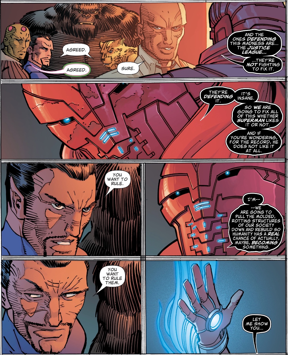 Luthor tells him his secret-revealing plan won’t work, and he ought to proceed instead by making it all about him. Leviathan is clearly ripe for the switch to Evil Autocrat (“I am appreciating this. Go on.”) Boom – new story, newly motivated villain. Leviathan’s ego has been stroked and he relishes ruling the world. Everything is reset in one panel. (Obviously there will be double-crosses later. Luthor isn’t going to bow to Leviathan. And Leviathan may just be playing along. We’ll see – if we keep reading.)