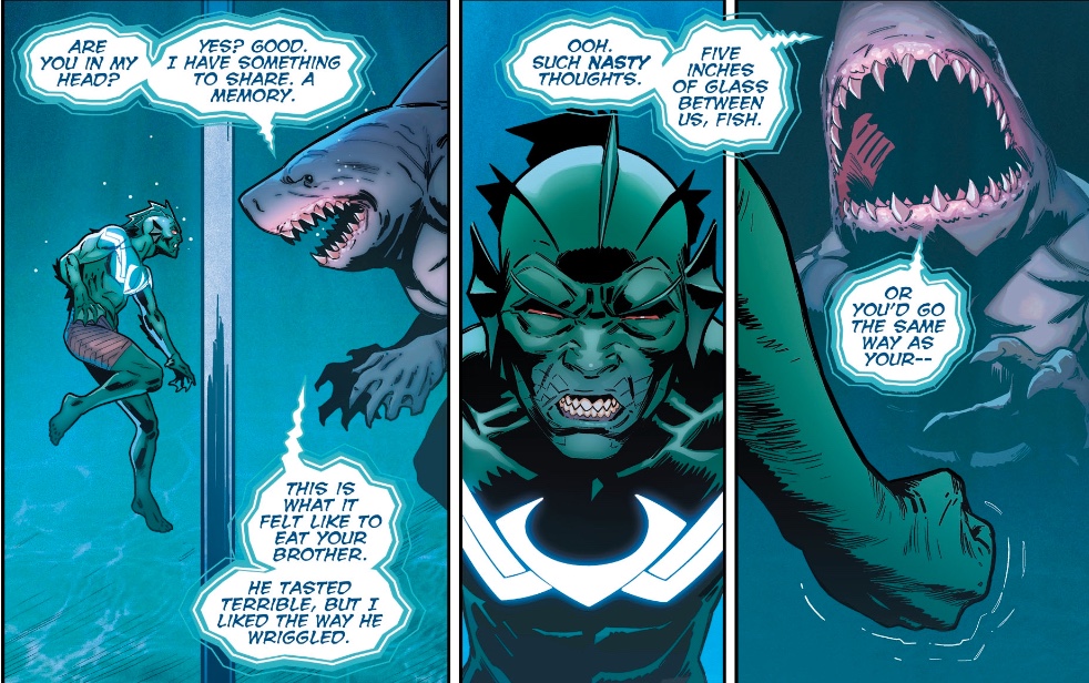 I know, an elliptical pause! That’s to imply the tension in this second issue of the revamped series from writer Tom Taylor, illustrator Bruno Redondo, colourist Adriano Lucas, letterer Wes Abbott, editors Andrea Shea and Alex R Carr and the trusty production department folk. Little by little we’re getting to know the new characters, with aquatic telepath Fin getting the best showcase this time.