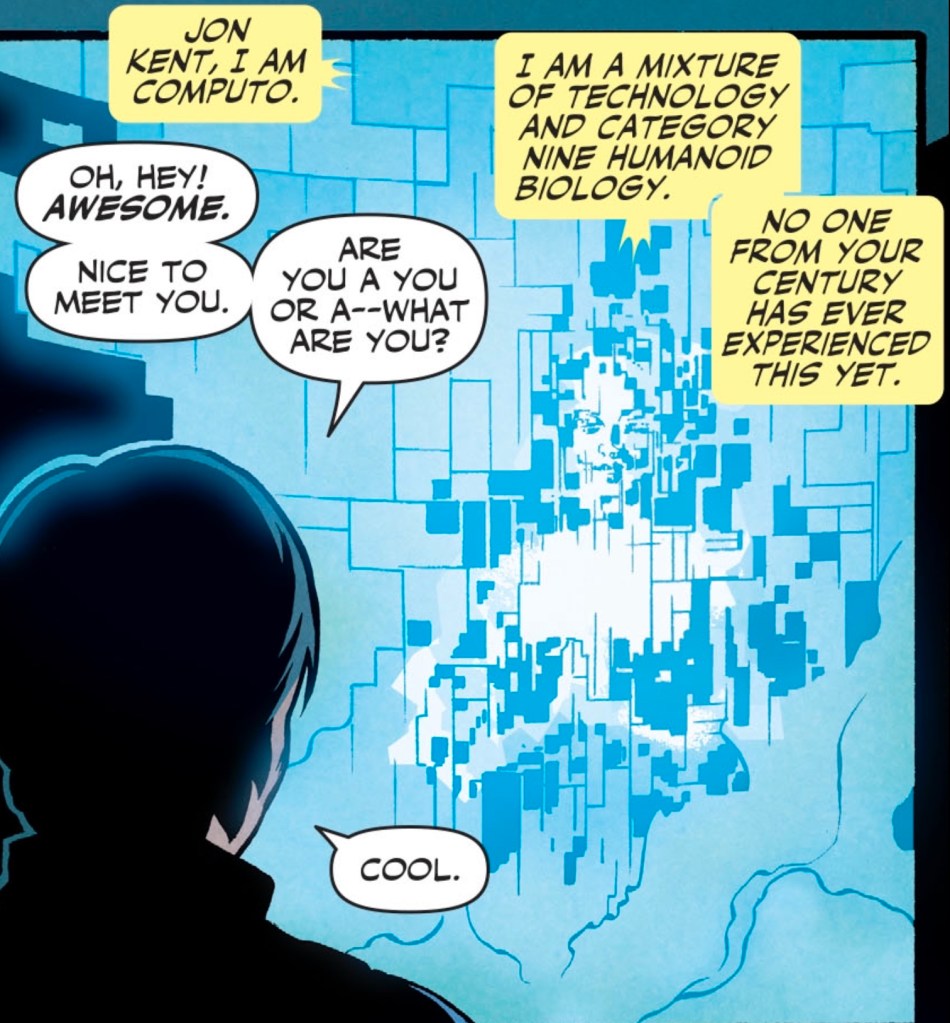 It’s the 31st Century, Superboy Jon Kent has joined the Legion of Super-Heroes and it’s time to learn how the team was founded. His guide? The AI known as Computo.