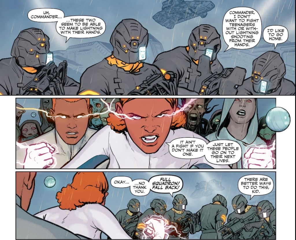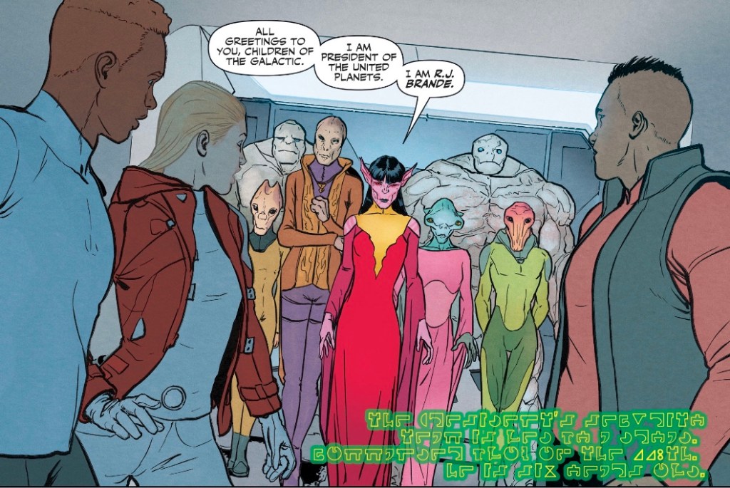 Some time later, the three gifted youngsters – Ayla wants nothing to do with the ‘United Mobsters of Corruption’ – are on their way to their mentorships, when they receive a surprise visit… from Galactic President RJ Brande.