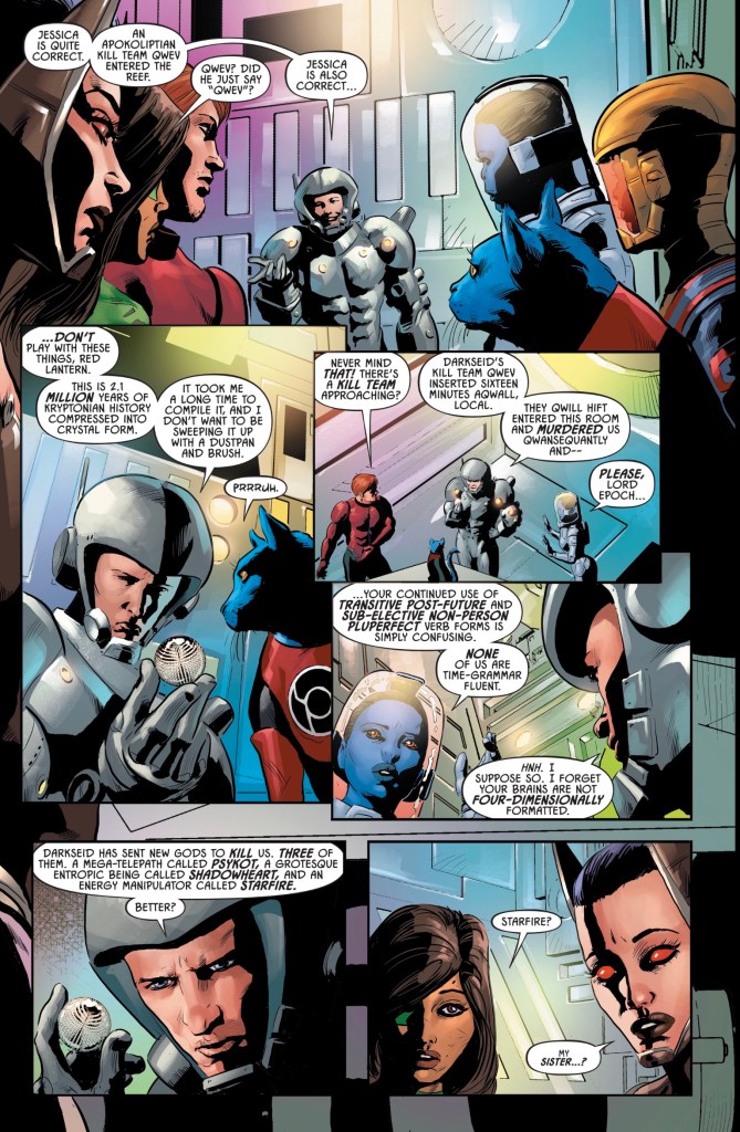 And a roll call, too. This is a Justice League book and roll calls are a grand tradition… I could have seen Hax and Gamma Knife, realised I had no idea who they were or why they’re here, wiki-ed them and had a much better time with the story. Instead, I was waiting for an info-dump that never came.