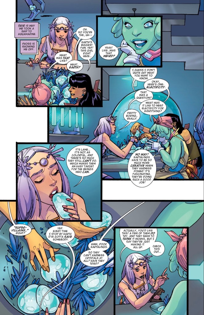 As for Phoss, she teaches Amethyst a couple of lessons this time – not everyone needs protecting, and it’s not all about her. Weighed down by her responsibilities, Amethyst tends to assume every challenge is a burden for her alone; hopefully soon she’ll relax and smell the flowers along the way. Our heroine is very capable, though, able to recognise trouble and react and adapt as needed. This issue she’s extremely adept at using an ability Elba helps her unlock, one connected to gifts from adoptive parents Marion and Herb, presents she had dismissed as silly attempts to connect with her Gemworld life.