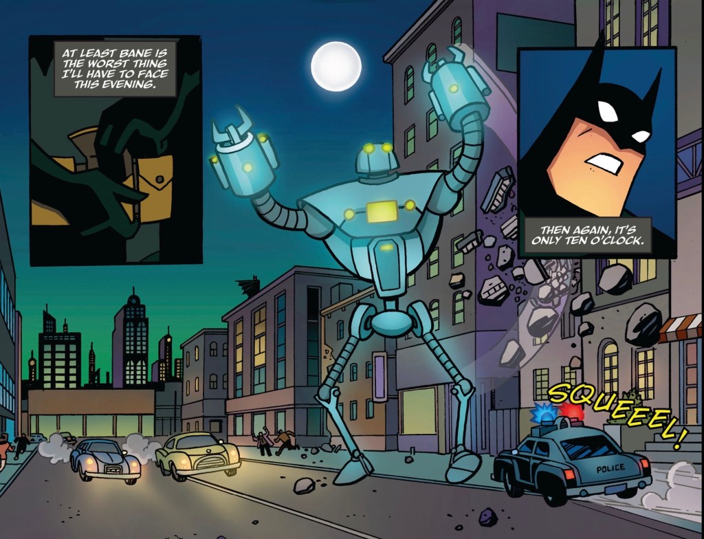 Batman’s looking particularly animated as he faces Bane for the umpteenth time. The bulky bad guy, as ever, wants to break the Caped Crusader’s back but Batman beats him without too many problems. Soon, though, he has a bigger headache.