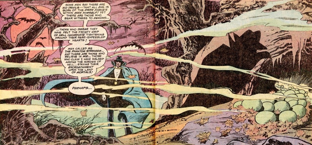 The Phantom Stranger sequence is written by Gerry Conway and is equally gripping, the script being portentous but never corny. Terry Thirteen acts as the ghostly guardian’s agent, despatching a very definite demon… then drenching himself once more in denial, before the Stranger is forced to get his gloved hands dirty against Tala.
